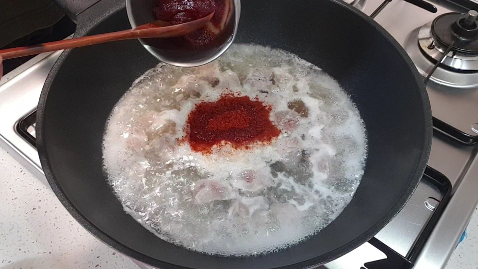 고기를 넣고 끓이다가 다진 마늘 한 스푼을 넣고,